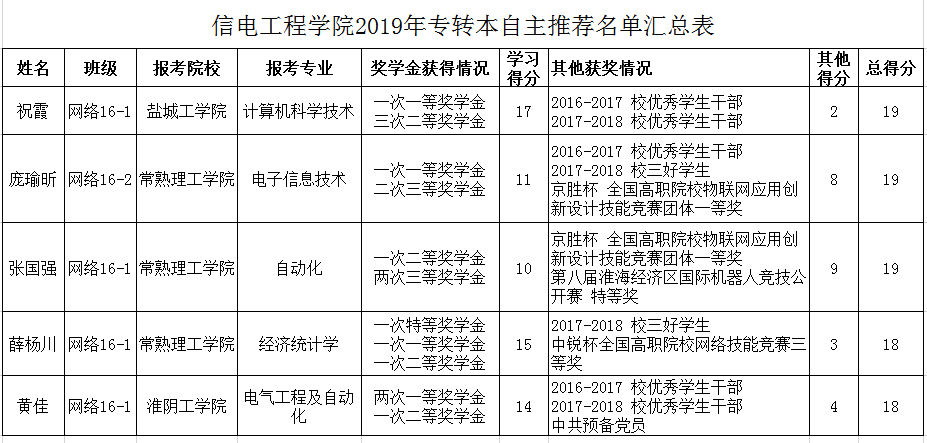 根据《省教育厅关于做好2019年“专转本”工作的通知》(苏教学﹝2018﹞6号文)、《省教育厅关于做好2019年普通高校“专转本”自主招生工作的通知》(苏教学﹝2018﹞7号文)以及《伟德体育2019年“专转本”自主招生推荐工作实施办法》的具体要求,在考生自愿报名的基础上,经班主任推荐,公司初审后,拟报送以下同学参加公司2019年“专转本”自主推荐选拔: