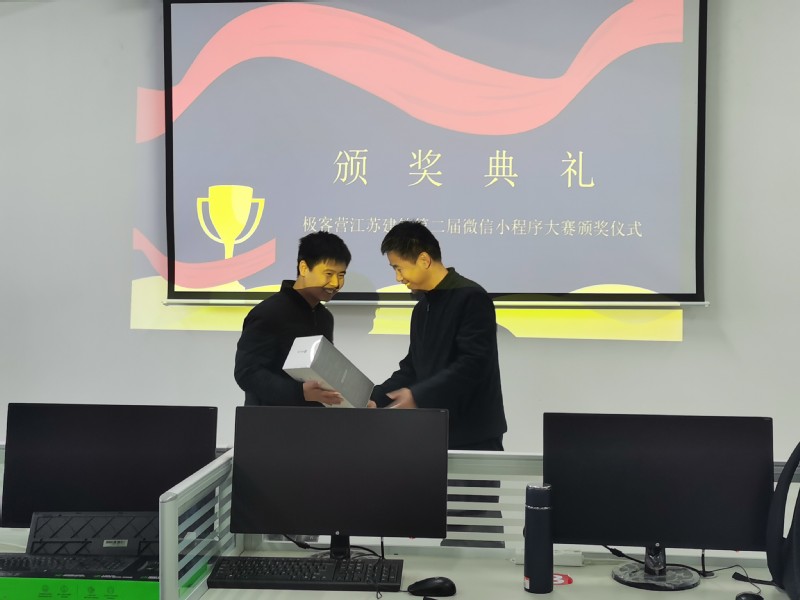 2021年1月7日下午,由公司主办、常州极客营信息科技有限公司协办的第二届“极客营杯”微信小程序设计决赛及颁奖典礼在第一实训楼309教室成功举行。信电公司经理吴兆立、副经理梁晓弘、协办方代表以及参与此次竞赛活动部分教师、同学出席颁奖典礼。决赛及颁奖典礼由梁经理主持。