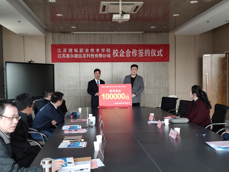 签约仪式上,王泳辰总经理介绍了公司的历史、现状以及将来发展目标,也感谢公司往届毕业生给公司创造的价值,并把公司作为公司第一家的合作高校。娄志刚处长介绍公司的办学历史、办学特色以及校企合作政策。Bevictor伟德官网经理吴兆立向王泳辰一行介绍了公司的办学规模、专任教师和专业发展等基本情况。双方针对现代学徒制人才培养模式、人才培养方案开发实施和信息技术应用等方面进行了详细交流与深入探讨。同时,江苏盖尔德信息科技有限公司向公司捐助教育基金人民币十万元。