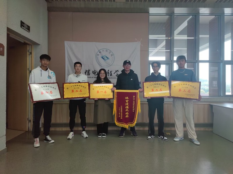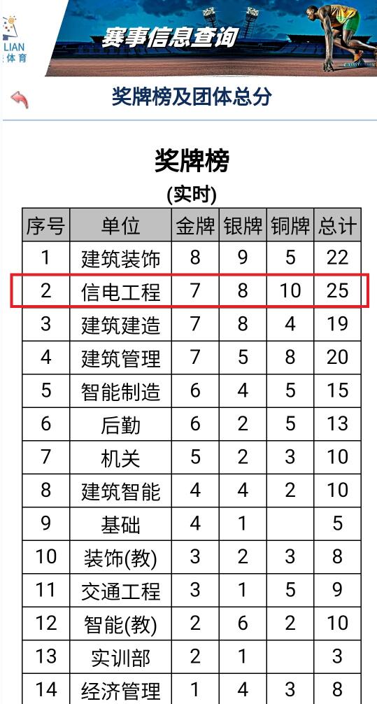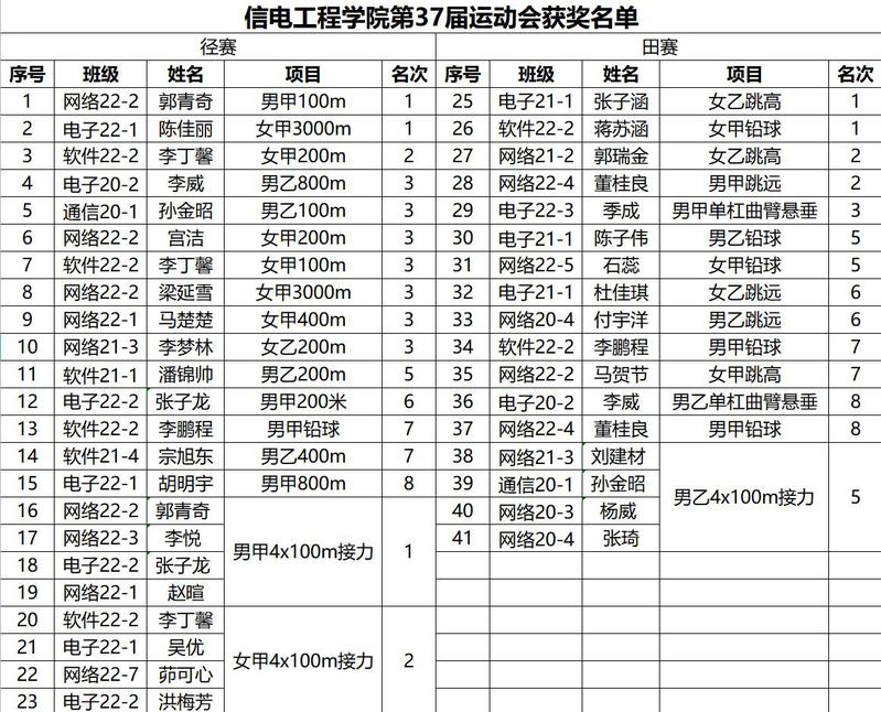 运动场上,公司运动健儿们顽强拼搏、奋勇争先,在多个比赛项目中斩获佳绩。其中,网络22-2班郭青奇在男子甲组100米决赛中摘得桂冠;电子22-1班陈佳丽获得女子甲组3000米冠军;电子21-1班张子涵获得女乙组跳高冠军;软件22-2班蒋苏涵获得女子甲组铅球冠军;网络22-2班郭青奇 、网络22-3班李悦 、电子22-2班张子龙 、网络22-1班赵暄获得男子甲组4x100m接力赛冠军。公司运动健儿各项比赛共获得7金、8银、10铜,获奖牌总数位列全校奖牌榜第1名。